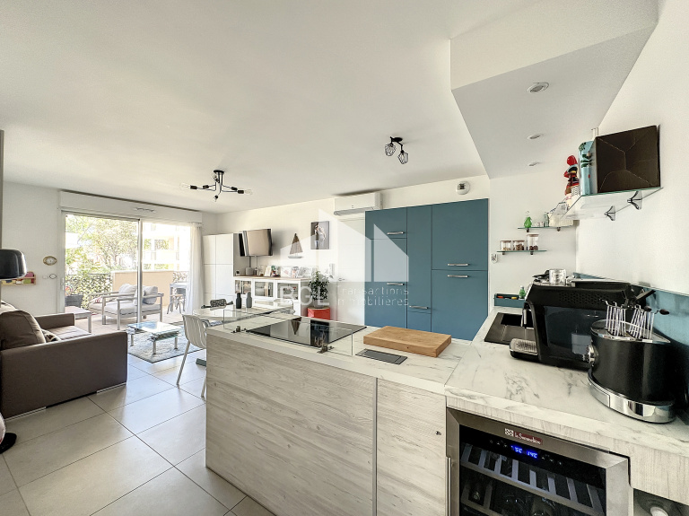 Il bénéficie d'une belle pièce de vie donnant sur une magnifique terrasse couverte, d'une cuisine ouverte entièrement équipée (cave, lave-vaisselle ...)
