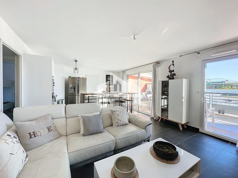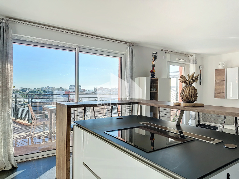 Il bénéficie de 3 chambres spacieuses, d'un séjour lumineux avec du mobilier sur mersure donnant sur une très belle terrasse et d'une superbe cuisine ouverte sur celui-ci, entièrement équipée.