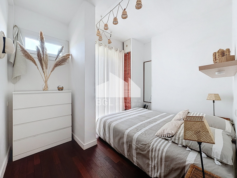 Idéalement situé avec un accès direct à la plage, ce trois-pièces traversant offre une vue mer remarquable. Lumineux et dépaysant, il séduit par son aménagement confortable au style nautique.
